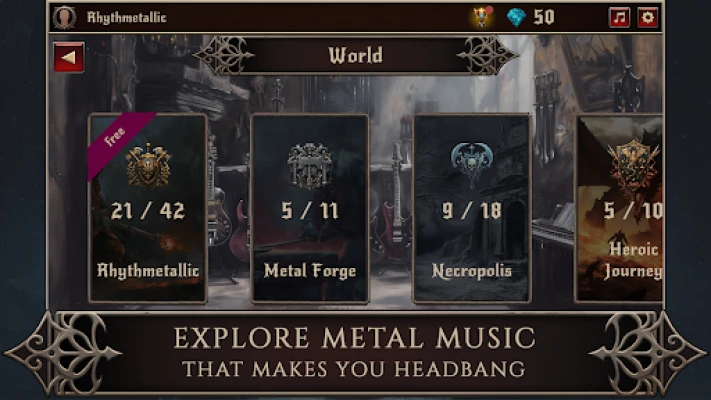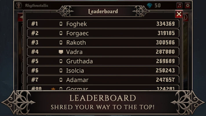 Za sve one koji traže dodatno uzbuđenje, Rhythmetallic nudi globalnu listu najboljih igrača – dokažite da ste vešti gitarista i popnite se na sam vrh lestvice. Usudite se da uđete u Arenu, gde se nedeljni izazovi osvežavaju nasumično odabranim pesmama i jedinstvenim mutacijama koje menjaju dinamiku igre. Svaka borba u Areni je nova prilika da zasvirate digitalnu gitaru i osvojite najveće nagrade, osiguravajući da iskustvo nikada ne postane monotono. Rhythmetallic je kreiran za istinske ljubitelje metala, pružajući ne samo igru veštine već i platformu za uživanje u fantastičnoj muzici. Prepustite se majstorstvu gitarskih rifova i uživajte u svakom trenutku dok kucate u ritmu visokokvalitetnih kompozicija.