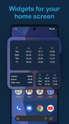 Ne propustite ni čuveni „zlatni sat" i „plavi sat", idealne za magične fotografije, kao ni detaljna vremena građanskog, nautičkog i astronomskog sumraka. Za potpunu udobnost, integrisan je vidžet za početni ekran koji prikazuje ključne informacije na dohvat ruke, a tu je i mogućnost detekcije vaše trenutne lokacije putem GPS-a, kao i kreiranje liste omiljenih mesta za brz pristup. Sve to dolazi upakovano u potpuno iskustvo bez oglasa, obezbeđujući neprekinut i čist doživljaj. Otkrijte lepotu svakog dana na nov način, sa potpunom informisanošću o sunčevim ciklusima.